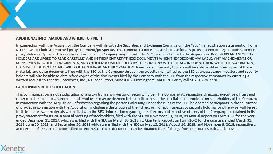 ADDITIONAL INFORMATION AND WHERE TO FIND IT In connection with the Acquisition, the Company will file with the Securities and Exchange Commission (the “SEC”), a registra tio n statement on Form S - 4 that will include a combined proxy statement/prospectus. This communication is not a substitute for any proxy statement, re g istration statement, proxy statement/prospectus or other documents the Company may file with the SEC in connection with the Acquisition. INVESTORS AN D SECURITY HOLDERS ARE URGED TO READ CAREFULLY AND IN THEIR ENTIRETY THESE DOCUMENTS WHEN THEY BECOME AVAILABLE, ANY AMENDMENTS OR SUPPLEMENTS TO THESE DOCUMENTS, AND OTHER DOCUMENTS FILED BY THE COMPANY WITH THE SEC IN CONNECTION WITH THE ACQUISITION, BECAUSE THESE DOCUMENTS WILL CONTAIN IMPORTANT INFORMATION. Investors and security holders will be able to obtain free copies of these materials and other documents filed with the SEC by the Company through the website maintained by the SEC at www.sec.gov. Inv est ors and security holders will also be able to obtain free copies of the documents filed by the Company with the SEC from the respective compan ies by directing a written request to Xenetic Biosciences, Inc., 40 Speen Street, Suite #102, Framingham, MA 01701 or by calling 781 - 778 - 7720. PARTICIPANTS IN THE SOLICITATION This communication is not a solicitation of a proxy from any investor or security holder. The Company, its respective directo rs, executive officers and other members of its management and employees may be deemed to be participants in the solicitation of proxies from shareholde rs of the Company in connection with the Acquisition. Information regarding the persons who may, under the rules of the SEC, be deemed particip ant s in the solicitation of proxies in connection with the Acquisition, including a description of their direct or indirect interests, by security hol din gs or otherwise, will be set forth in the relevant materials when filed with the SEC. Information regarding the directors and executive officers of the Co mpa ny is contained in its proxy statement for its 2018 annual meeting of stockholders, filed with the SEC on November 13, 2018, its Annual Report on Fo rm 10 - K for the year ended December 31, 2017, which was filed with the SEC on March 30, 2018, its Quarterly Reports on Form 10 - Q for the quarters end ed March 31, 2018, June 30, 2018, and September 30, 2018 which were filed with the SEC on May 15, 2018, August 10, 2018, and November 9, 2 018 , respectively, and certain of its Current Reports filed on Form 8 - K. These documents can be obtained free of charge from the sources indicated above. 3
