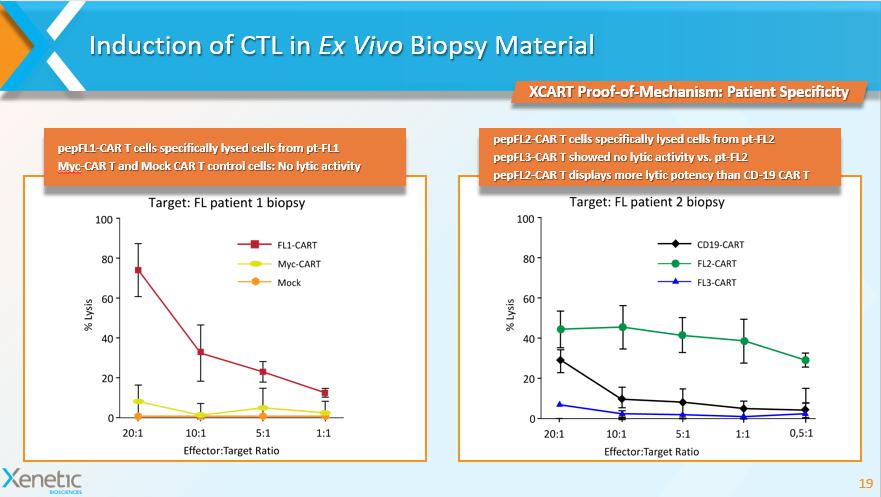 Induction of CTL in Ex Vivo Biopsy Material 19 XCART Proof - of - Mechanism: Patient Specificity pepFL1 - CAR T cells specifically lysed cells from pt - FL1 Myc - CAR T and Mock CAR T control cells: No lytic activity pepFL2 - CAR T cells specifically lysed cells from pt - FL2 pepFL3 - CAR T showed no lytic activity vs. pt - FL2 pepFL2 - CAR T displays more lytic potency than CD - 19 CAR T