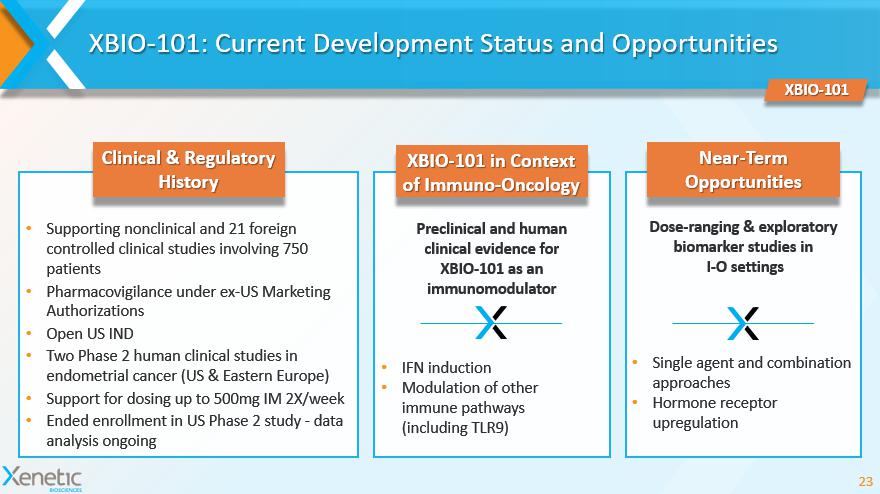 XBIO - 101: Current Development Status and Opportunities 23 XBIO - 101 XBIO - 101 in Context of Immuno - Oncology Preclinical and human clinical evidence for XBIO - 101 as an immunomodulator • IFN induction • Modulation of other immune pathways (including TLR9) • Supporting nonclinical and 21 foreign controlled clinical studies involving 750 patients • Pharmacovigilance under ex - US Marketing Authorizations • Open US IND • Two Phase 2 human clinical studies in endometrial cancer (US & Eastern Europe) • Support for dosing up to 500mg IM 2X/week • Ended enrollment in US Phase 2 study - data analysis ongoing Clinical & Regulatory History • Single agent and combination approaches • Hormone receptor upregulation Dose - ranging & exploratory biomarker studies in I - O settings Near - Term Opportunities