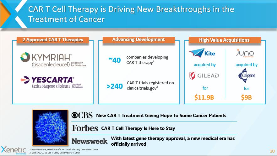 CAR T Cell Therapy is Driving New Breakthroughs in the Treatment of Cancer 10 New CAR T Treatment Giving Hope To Some Cancer Patients companies developing CAR T therapy 1 2 Approved CAR T Therapies Advancing Development High Value Acquisitions ~40 $11.9B acquired by for $9B acquired by for CAR T Cell Therapy Is Here to Stay With latest gene therapy approval, a new medical era has officially arrived CAR T trials registered on clinicaltrials.gov 2 >240 1: BioInformant , Database of CAR T - Cell Therapy Companies 2018 2: Cell 171, CD19 Car T Cells, December 14, 2017