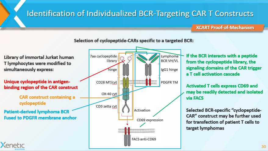 Identification of Individualized BCR - Targeting CAR T Constructs 30 Selection of cyclopeptide - CARs specific to a targeted BCR: 7aa cyclopeptide library hinge CD28 MT/ cyt OX - 40 cyt CD3 zetta cyt Lymphoma BCR VH/VL IgG1 hinge PDGFR TM Activation FACS anti - CD69 Library of immortal Jurkat human T lymphocytes were modified to simultaneously express: Unique cyclopeptide in antigen - binding region of the CAR construct If the BCR interacts with a peptide from the cyclopeptide library, the signaling domains of the CAR trigger a T cell activation cascade Activated T cells express CD69 and may be readily detected and isolated via FACS Selected BCR - specific “cyclopeptide - CAR” construct may be further used for transfection of patient T cells to target lymphomas XCART Proof - of - Mechanism CD69 expression CAR construct containing a cyclopeptide Patient - derived lymphoma BCR Fused to PDGFR membrane anchor