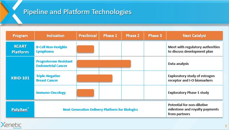 Investment Highlights 4 Transformative acquisition positions Xenetic to address high value oncology market with innovative XCART platform XCART Platform 1 Expanding the potential of CAR T cell therapy • Proof - of - mechanism and preclinical evidence of target specificity • Expect to meet with regulatory authorities to discuss development plan • Over $5 billion initial market opportunity in B - cell non - Hodgkin lymphoma 2 XBIO - 101 Phase 2 oncology asset • Clinical body of data sufficient for Phase 2 studies in multiple indications • Well suited for immuno - oncology combination therapies 1: The acquisition of 1) Hesperix , which owned rights to the XCART platform based on the assignment agreement discussed in greater detail in a form 8 - K file with the SEC, and 2) an exclusive license of the rights to the XCART platform owned by Scripps Research Institute obtained through an assignment agreement discussed in greater detail in a form 8 - K file with the SEC, are sub ject to closing; 2: Market Reports World. GLOBAL NON - HODGKIN LYMPHOMA THERAPEUTICS MARKET - SEGMENTED BY TYPE OF TREATMENT - GROWTH, TRENDS AND FORECASTS (2018 - 2023); BioPharm Insight Surveillance, Epidemiology, and End Results (SEER) 9 registries, National Cancer Institute, 2017