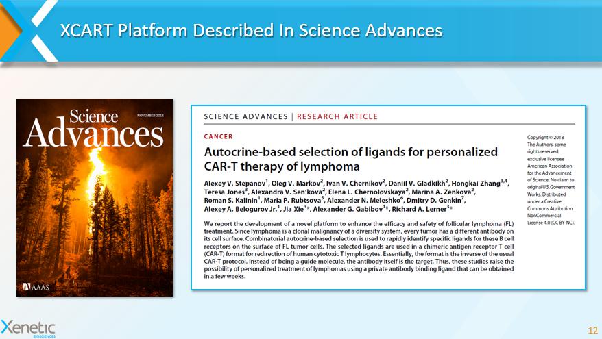 XCART Transforms CAR T Therapy 11 XCART constructs can target patient - specific tumor neoantigens Established proof - of - mechanism in B - cell lymphomas Potential to address multiple tumor types XCART is a proximity - based screening platform Derived from Scripps technology Proprietary cell - based screening technology Compatible with current up - and down - stream CAR T manufacturing processes Applicable to a wide range of CAR T constructs Enables rapid construction of functional CARs & TCRs XCART