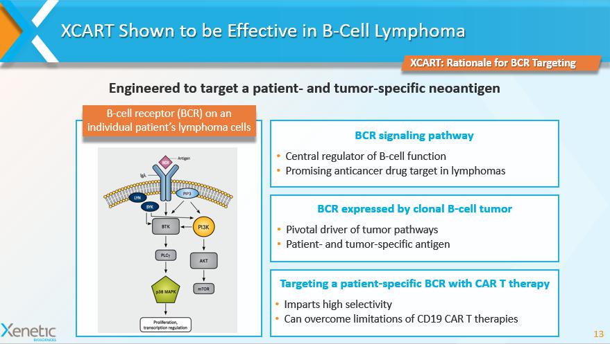 XCART Shown to be Effective in B - Cell Lymphoma 13 XCART: Rationale for BCR Targeting Engineered to target a patient - and tumor - specific neoantigen B - cell receptor (BCR) on an individual patient’s lymphoma cells BCR signaling pathway • Central regulator of B - cell function • Promising anticancer drug target in lymphomas BCR expressed by clonal B - cell tumor • Pivotal driver of tumor pathways • Patient - and tumor - specific antigen Targeting a patient - specific BCR with CAR T therapy • Imparts high selectivity • Can overcome limitations of CD19 CAR T therapies
