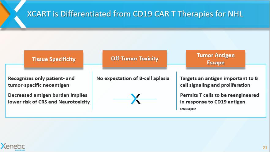 XCART is Differentiated from CD19 CAR T Therapies for NHL 21 Tissue Specificity Off - Tumor Toxicity Tumor Antigen Escape Recognizes only patient - and tumor - specific neoantigen Decreased antigen burden implies lower risk of CRS and Neurotoxicity No expectation of B - cell aplasia Targets an antigen important to B cell signaling and proliferation Permits T cells to be reengineered in response to CD19 antigen escape
