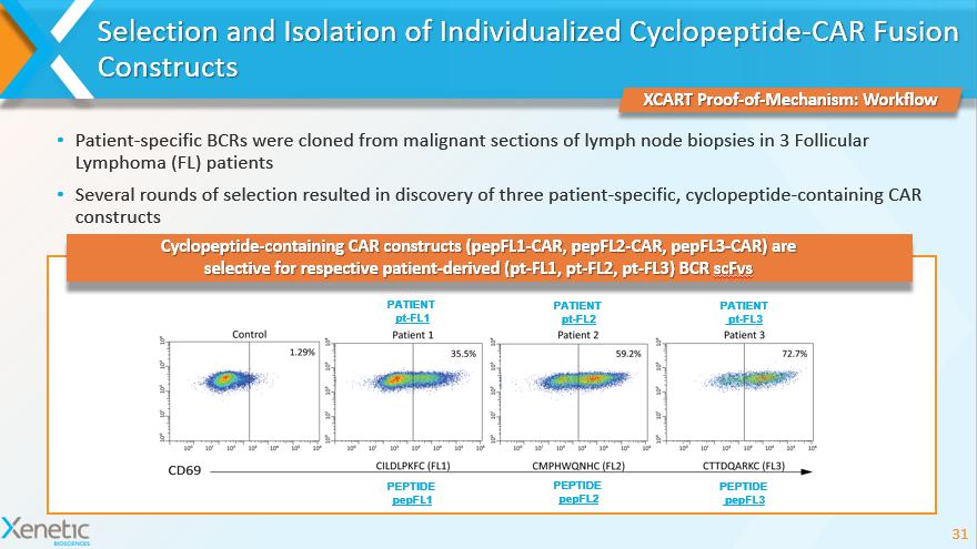 Identification of Individualized BCR - Targeting CAR T Constructs 30 Selection of cyclopeptide - CARs specific to a targeted BCR: 7aa cyclopeptide library hinge CD28 MT/ cyt OX - 40 cyt CD3 zetta cyt Lymphoma BCR VH/VL IgG1 hinge PDGFR TM Activation FACS anti - CD69 Library of immortal Jurkat human T lymphocytes were modified to simultaneously express: Unique cyclopeptide in antigen - binding region of the CAR construct If the BCR interacts with a peptide from the cyclopeptide library, the signaling domains of the CAR trigger a T cell activation cascade Activated T cells express CD69 and may be readily detected and isolated via FACS Selected BCR - specific “cyclopeptide - CAR” construct may be further used for transfection of patient T cells to target lymphomas XCART Proof - of - Mechanism CD69 expression CAR construct containing a cyclopeptide Patient - derived lymphoma BCR Fused to PDGFR membrane anchor
