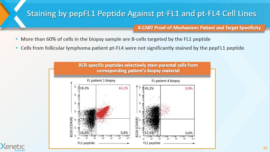 • Patient - specific BCRs were cloned from malignant sections of lymph node biopsies in 3 Follicular Lymphoma (FL) patients • Several rounds of selection resulted in discovery of three patient - specific, cyclopeptide - containing CAR constructs Selection and Isolation of Individualized Cyclopeptide - CAR Fusion Constructs 31 XCART Proof - of - Mechanism: Workflow Cyclopeptide - containing CAR constructs (pepFL1 - CAR, pepFL2 - CAR, pepFL3 - CAR) are selective for respective patient - derived (pt - FL1, pt - FL2, pt - FL3) BCR scFvs PATIENT pt - FL1 PATIENT pt - FL2 PATIENT pt - FL3 PEPTIDE pepFL1 PEPTIDE pepFL2 PEPTIDE pepFL3