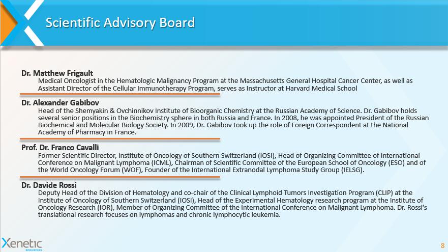 Scientific Advisory Board 8 Dr. Matthew Frigault Medical Oncologist in the Hematologic Malignancy Program at the Massachusetts General Hospital Cancer Center, as well as Assistant Director of the Cellular Immunotherapy Program, serves as Instructor at Harvard Medical School Dr. Alexander Gabibov Head of the Shemyakin & Ovchinnikov Institute of Bioorganic Chemistry at the Russian Academy of Science. Dr. Gabibov holds several senior positions in the Biochemistry sphere in both Russia and France. In 2008, he was appointed President of the Rus sia n Biochemical and Molecular Biology Society. In 2009, Dr. Gabibov took up the role of Foreign Correspondent at the National Academy of Pharmacy in France. Prof. Dr. Franco Cavalli Former Scientific Director, Institute of Oncology of Southern Switzerland (IOSI), Head of Organizing Committee of Internation al Conference on Malignant Lymphoma (ICML), Chairman of Scientific Committee of the European School of Oncology (ESO) and of the World Oncology Forum (WOF), Founder of the International Extranodal Lymphoma Study Group (IELSG). Dr. Davide Rossi Deputy Head of the Division of Hematology and co - chair of the Clinical Lymphoid Tumors Investigation Program (CLIP) at the Institute of Oncology of Southern Switzerland (IOSI), Head of the Experimental Hematology research program at the Institute o f Oncology Research (IOR), Member of Organizing Committee of the International Conference on Malignant Lymphoma. Dr. Rossi’s translational research focuses on lymphomas and chronic lymphocytic leukemia.