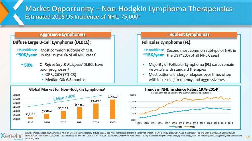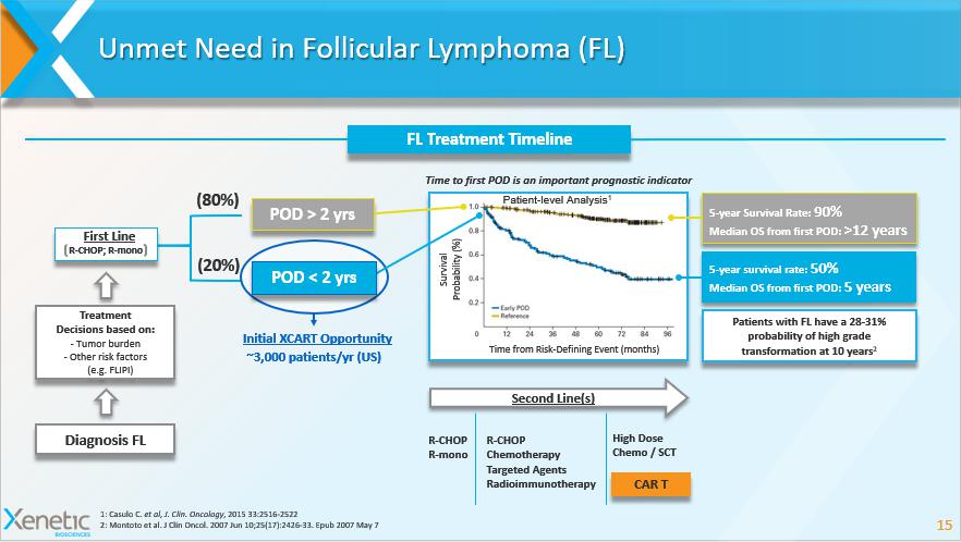Market Opportunity – Non - Hodgkin Lymphoma Therapeutics Estimated 2018 US Incidence of NHL: 75,000 1 14 1: https://seer.cancer.gov/; 2: Crump, M et al . Outcomes in refractory diffuse large B - cell lymphoma: results from the international SCHOLAR - 1 study. Blood 2017 Aug 3; 3: Market Reports World. GLOBAL NON - HODGKIN LYMPHOMA THERAPEUTICS MARKET - SEGMENTED BY TYPE OF TREATMENT - GROWTH, TRENDS AND FORECASTS (2018 - 2023); BioPharm Insight Surveillance, Epidemiology, and End Results (SEER) 9 registries, National Cancer Institute, 2017 XBIO - 101 Aggressive Lymphomas Most common subtype of NHL in the US (~40% of all NHL cases) ~30K/year ~ 50% Diffuse Large B - Cell Lymphoma (DBLCL): Of Refractory & Relapsed DLBCL have poor prognoses: 2 • ORR: 26% (7% CR) • Median OS: 6.3 months Follicular Lymphoma (FL): Second most common subtype of NHL in the US (~20% of all NHL Cases) • Majority of Follicular Lymphoma (FL) cases remain incurable with standard therapies • Most patients undergo relapses over time, often with increasing frequency and aggressiveness $5,213.6 $5,599.4 $6,013.7 $6,458.7 $6,936.7 $7,450.0 $5000 $5500 $6000 $6500 $7000 $7500 $8000 2018 2019 2020 2021 2022 2023 Global Market for Non - Hodgkin Lymphoma 3 8.00 13.00 18.00 23.00 28.00 1975 1978 1981 1984 1987 1990 1993 1996 1999 2002 2005 2008 2011 2014 Trends in NHL Incidence Rates, 1975 - 2014 3 Female Male Per 100,000, age adjusted to the 2000 US standard population. Indolent Lymphomas US Incidence ~15K/year US Incidence