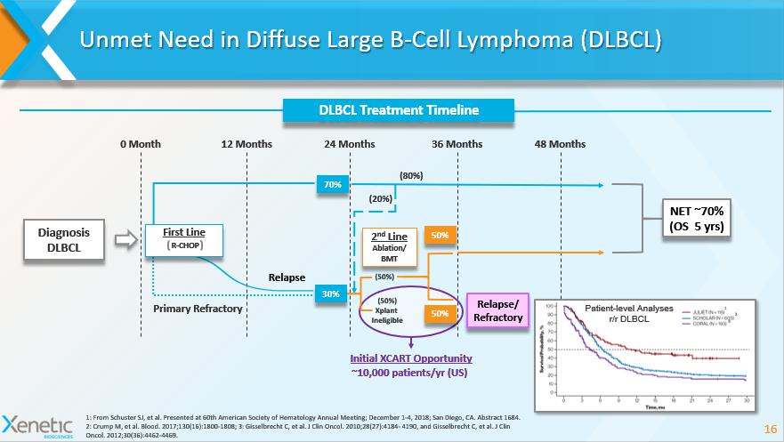 Unmet Need in Follicular Lymphoma (FL) 15 1: Casulo C. et al , J. Clin. Oncology , 2015 33:2516 - 2522 2: Montoto et al. J Clin Oncol. 2007 Jun 10;25(17):2426 - 33. Epub 2007 May 7 Time from Risk - Defining Event (months) Survival Probability (%) FL Treatment Timeline 5 - year Survival Rate: 90% Median OS from first POD: >12 years 5 - year survival rate: 50% Median OS from first POD: 5 years POD > 2 yrs (80%) (20%) R - CHOP; R - mono First Line Diagnosis FL Treatment Decisions based on: - Tumor burden - Other risk factors (e.g. FLIPI) Time to first POD is an important prognostic indicator CAR T Second Line(s) R - CHOP R - mono R - CHOP Chemotherapy Targeted Agents Radioimmunotherapy High Dose Chemo / SCT Patients with FL have a 28 - 31% probability of high grade transformation at 10 years 2 POD < 2 yrs Initial XCART Opportunity Patient - level Analysis 1 ~3,000 patients/ yr (US)