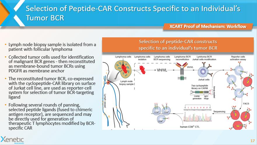 Selection of Peptide - CAR Constructs Specific to an Individual’s Tumor BCR 17 XCART Proof of Mechanism: Workflow Selection of peptide - CAR constructs specific to an individual’s tumor BCR • Lymph node biopsy sample is isolated from a patient with follicular lymphoma • Collected tumor cells used for identification of malignant BCR genes - then reconstituted as membrane - bound tumor BCRs using PDGFR as membrane anchor • The reconstituted tumor BCR, co - expressed with the cyclopeptide - CAR library on surface of Jurkat cell line, are used as reporter - cell system for selection of tumor BCR - targeting ligand • Following several rounds of panning, selected peptide ligands (fused to chimeric antigen receptor), are sequenced and may be directly used for generation of therapeutic T lymphocytes modified by BCR - specific CAR