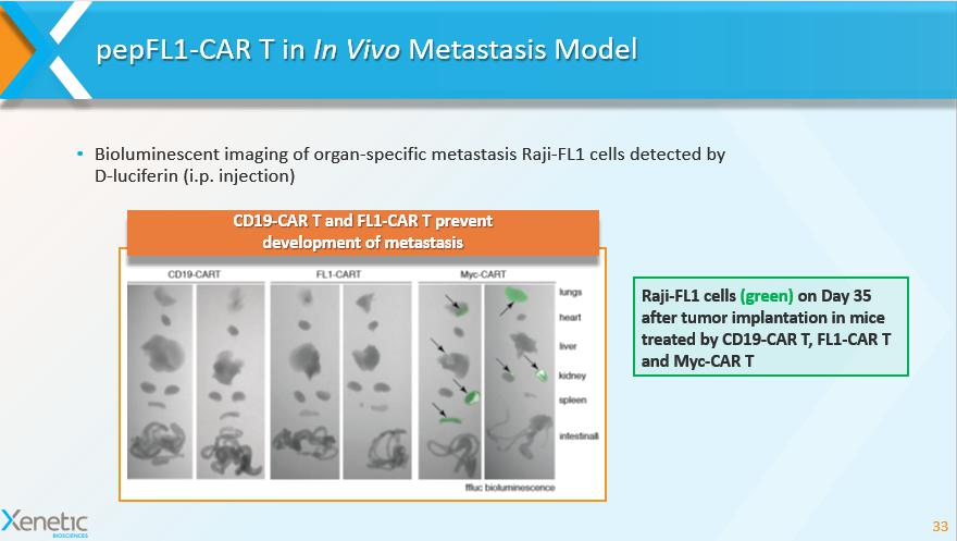 pepFL1 - CAR T in In Vivo Metastasis Model 33 Raji - FL1 cells (green) on Day 35 after tumor implantation in mice treated by CD19 - CAR T, FL1 - CAR T and Myc - CAR T CD19 - CAR T and FL1 - CAR T prevent development of metastasis • Bioluminescent imaging of organ - specific metastasis Raji - FL1 cells detected by D - luciferin ( i.p. injection)