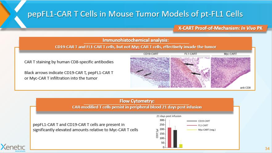 pepFL1 - CAR T Cells in Mouse Tumor Models of pt - FL1 Cells 34 X - CART Proof - of - Mechanism: In Vivo PK CAR T staining by human CD8 - specific antibodies Black arrows indicate CD19 - CAR T, pepFL1 - CAR T or Myc - CAR T infiltration into the tumor pepFL1 - CAR T and CD19 - CAR T cells are present in significantly elevated amounts relative to Myc - CAR T cells Immunohistochemical analysis: CD19 - CAR T and FL1 - CAR T cells, but not Myc - CAR T cells, effectively invade the tumor CAR - modified T cells persist in peripheral blood 21 days post infusion Flow Cytometry: