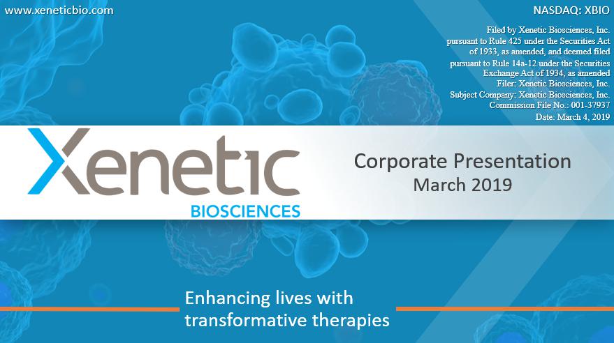 Enhancing lives with transformative therapies www.xeneticbio.com NASDAQ: XBIO Corporate Presentation February 2019 Filed by Xenetic Biosciences, Inc. pursuant to Rule 425 under the Securities Act of 1933, as amended, and deemed filed pursuant to Rule 14a - 12 under the Securities Exchange Act of 1934, as amended Filer: Xenetic Biosciences, Inc. Subject Company: Xenetic Biosciences, Inc. Commission File No.: 001 - 37937 Date: February 27, 2019