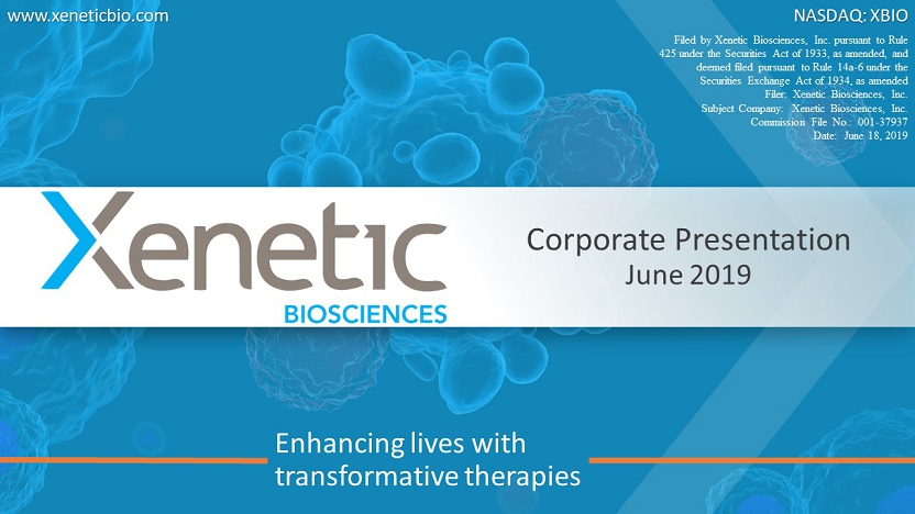 Enhancing lives with transformative therapies www.xeneticbio.com NASDAQ: XBIO Corporate Presentation June 2019 Filed by Xenetic Biosciences, Inc. pursuant to Rule 425 under the Securities Act of 1933, as amended, and deemed filed pursuant to Rule 14a - 6 under the Securities Exchange Act of 1934, as amended Filer: Xenetic Biosciences, Inc. Subject Company: Xenetic Biosciences, Inc. Commission File No.: 001 - 37937 Date: June 18, 2019