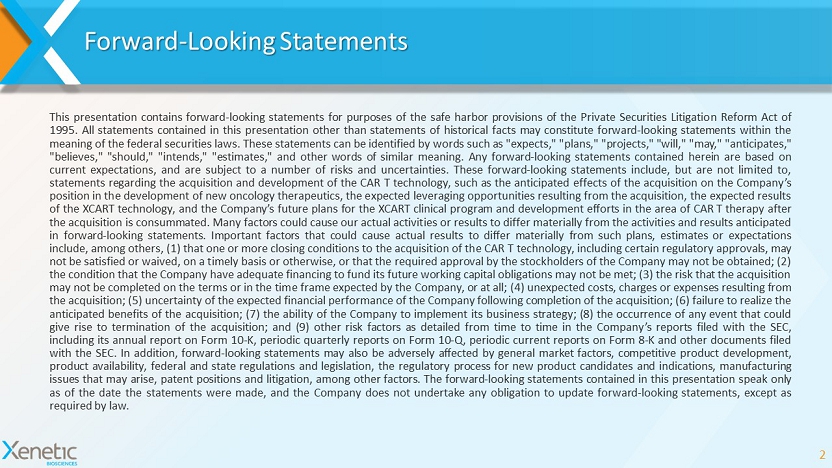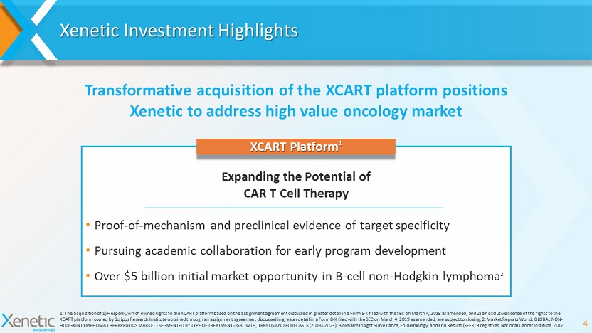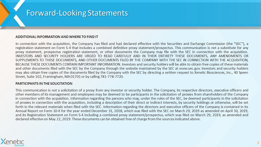 Forward - Looking Statements ADDITIONAL INFORMATION AND WHERE TO FIND IT In connection with the acquisition, the Company has filed and had declared effective with the Securities and Exchange Commission (the “SEC”), a registration statement on Form S - 4 that includes a combined definitive proxy statement/prospectus . This communication is not a substitute for any proxy statement, prospectus registration statement, or other documents the Company may file with the SEC in connection with the acquisition . INVESTORS AND SECURITY HOLDERS ARE URGED TO READ CAREFULLY AND IN THEIR ENTIRETY THESE DOCUMENTS, ANY AMENDMENTS OR SUPPLEMENTS TO THESE DOCUMENTS, AND OTHER DOCUMENTS FILED BY THE COMPANY WITH THE SEC IN CONNECTION WITH THE ACQUISITION, BECAUSE THESE DOCUMENTS CONTAIN IMPORTANT INFORMATION . Investors and security holders will be able to obtain free copies of these materials and other documents filed with the SEC by the Company through the website maintained by the SEC at www . sec . gov . Investors and security holders may also obtain free copies of the documents filed by the Company with the SEC by directing a written request to Xenetic Biosciences, Inc . , 40 Speen Street, Suite 102 , Framingham, MA 01701 or by calling 781 - 778 - 7720 . PARTICIPANTS IN THE SOLICITATION This communication is not a solicitation of a proxy from any investor or security holder . The Company, its respective directors, executive officers and other members of its management and employees may be deemed to be participants in the solicitation of proxies from shareholders of the Company in connection with the acquisition . Information regarding the persons who may, under the rules of the SEC, be deemed participants in the solicitation of proxies in connection with the acquisition, including a description of their direct or indirect interests, by security holdings or otherwise, will be set forth in the relevant materials when filed with the SEC . Information regarding the directors and executive officers of the Company is contained in its Annual Report on Form 10 - K for the year ended December 31 , 2018 , which was filed with the SEC on March 29 , 2019 as amended on April 30 , 2019 , and its Registration Statement on Form S - 4 including a combined proxy statement/prospectus, which was filed on March 29 , 2019 , as amended and declared effective on May 22 , 2019 . These documents can be obtained free of charge from the sources indicated above . 3