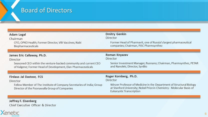 Experienced Management Team 5 Jeffrey F. Eisenberg Chief Executive Officer & Director Life Sciences executive with over 20 years of successful track record in value creation in both private and public companies; former CEO of Noven Pharmaceuticals and responsible for 2 product launches and led Noven’s Novogyne Women’s Health joint venture with Novartis Curtis Lockshin, Ph.D. Chief Scientific Officer 20 years Biotech/Pharma management experience, including discovery, preclinical and clinical development and commercial manufacturing; former CEO of SciVac Therapeutics, CTO of VBI Vaccines and VP of Corporate R&D Initiatives for OPKO Health James F. Parslow, MBA, CPA Chief Financial Officer Over 30 years of experience providing financial and business leadership to biotech, manufacturing, technology, business - to - business e - commerce and cleantech industries