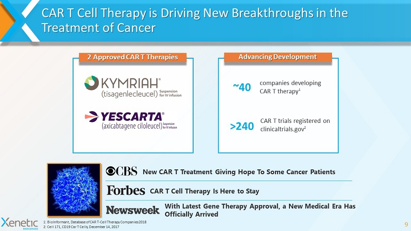 CAR T Cell Therapy is Driving New Breakthroughs in the Treatment of Cancer 9 New CAR T Treatment Giving Hope To Some Cancer Patients CAR T Cell Therapy Is Here to Stay With Latest Gene Therapy Approval, a New Medical Era Has Officially Arrived 1: BioInformant , Database of CAR T - Cell Therapy Companies 2018 2: Cell 171, CD19 Car T Cells, December 14, 2017 2 Approved CAR T Therapies companies developing CAR T therapy 1 Advancing Development ~40 CAR T trials registered on clinicaltrials.gov 2 >240