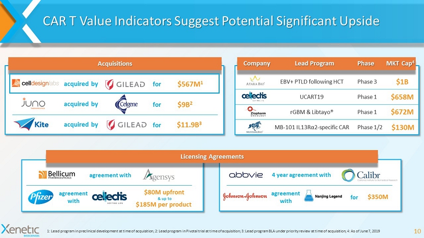 CAR T Value Indicators Suggest Potential Significant Upside 10 1: Lead program in preclinical development at time of acquisition; 2: Lead program in Pivotal trial at time of acquisition; 3 : L ead program BLA under priority review at time of acquisition; 4: As of June 7, 2019 EBV+ PTLD following HCT Phase 3 $1B UCART19 Phase 1 $658M rGBM & Libtayo ® Phase 1 $672M MB - 101 IL13R α2 - specific CAR Phase 1/2 $130M $9B 2 $567M 1 acquired by for acquired by for Acquisitions Company Lead Program Phase MKT Cap 4 agreement with agreement with $80M upfront $185M per product & up to 4 year agreement with agreement with $350M for Licensing Agreements $11.9B 3 acquired by for