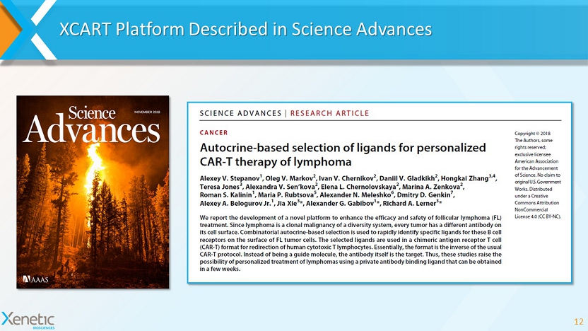XCART Has the Potential to Transform CAR T Therapy 11 • XCART constructs can target patient - specific tumor neoantigens • Established proof - of - mechanism in B - cell lymphomas • Potential to address various target and tumor types • Compatible with current up - and down - stream CAR T manufacturing processes • Applicable to a wide range of CAR T constructs • Enables rapid identification of functional CARs & TCRs XCART • Proprietary cell - based CAR screening platform • Proprietary autocrine technology licensed from Scripps (originating in Richard Lerner’s lab)