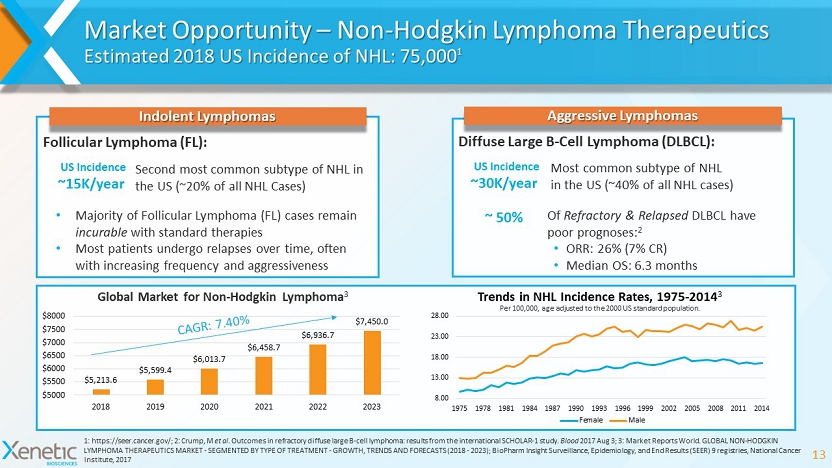 Market Opportunity – Non - Hodgkin Lymphoma Therapeutics Estimated 2018 US Incidence of NHL: 75,000 1 13 1: https://seer.cancer.gov/; 2: Crump, M et al . Outcomes in refractory diffuse large B - cell lymphoma: results from the international SCHOLAR - 1 study. Blood 2017 Aug 3; 3: Market Reports World. GLOBAL NON - HODGKIN LYMPHOMA THERAPEUTICS MARKET - SEGMENTED BY TYPE OF TREATMENT - GROWTH, TRENDS AND FORECASTS (2018 - 2023); BioPharm Insight Surveillance, Epidemiology, and End Results (SEER) 9 registries, National Cancer Institute, 2017 XBIO - 101 Aggressive Lymphomas Most common subtype of NHL in the US (~40% of all NHL cases) ~30K/year ~ 50% Diffuse Large B - Cell Lymphoma (DLBCL): Of Refractory & Relapsed DLBCL have poor prognoses: 2 • ORR: 26% (7% CR) • Median OS: 6.3 months Follicular Lymphoma (FL): Second most common subtype of NHL in the US (~20% of all NHL Cases) • Majority of Follicular Lymphoma (FL) cases remain incurable with standard therapies • Most patients undergo relapses over time, often with increasing frequency and aggressiveness $5,213.6 $5,599.4 $6,013.7 $6,458.7 $6,936.7 $7,450.0 $5000 $5500 $6000 $6500 $7000 $7500 $8000 2018 2019 2020 2021 2022 2023 Global Market for Non - Hodgkin Lymphoma 3 8.00 13.00 18.00 23.00 28.00 1975 1978 1981 1984 1987 1990 1993 1996 1999 2002 2005 2008 2011 2014 Trends in NHL Incidence Rates, 1975 - 2014 3 Female Male Per 100,000, age adjusted to the 2000 US standard population. Indolent Lymphomas US Incidence ~15K/year US Incidence