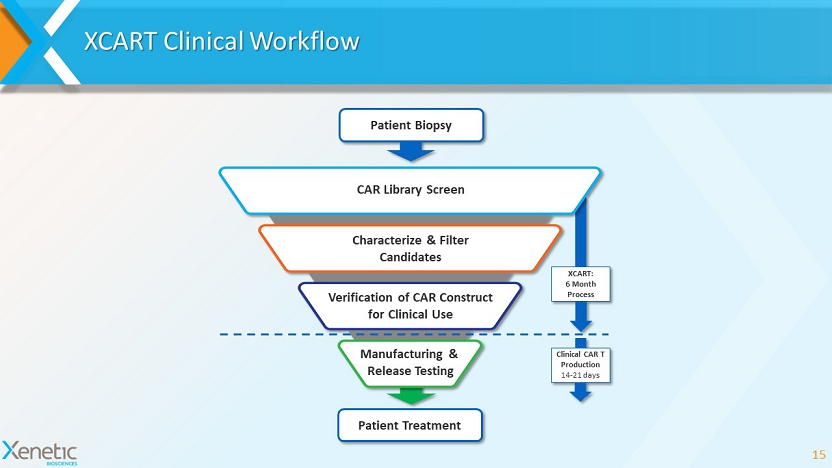 Clinical CAR T Production 14 - 21 days XCART: 6 Month Process Manufacturing & Release Testing CAR Library Screen Characterize & Filter Candidates Verification of CAR Construct for Clinical Use Patient Treatment Patient Biopsy XCART Clinical Workflow 15