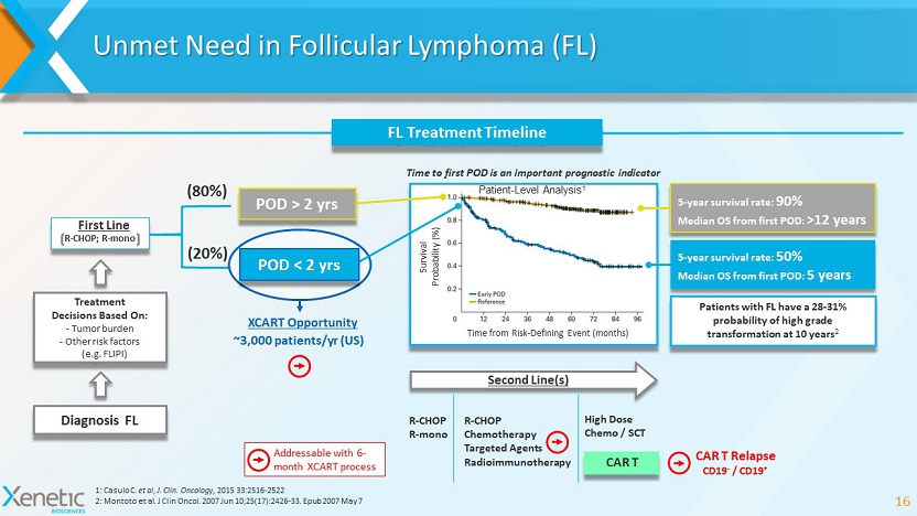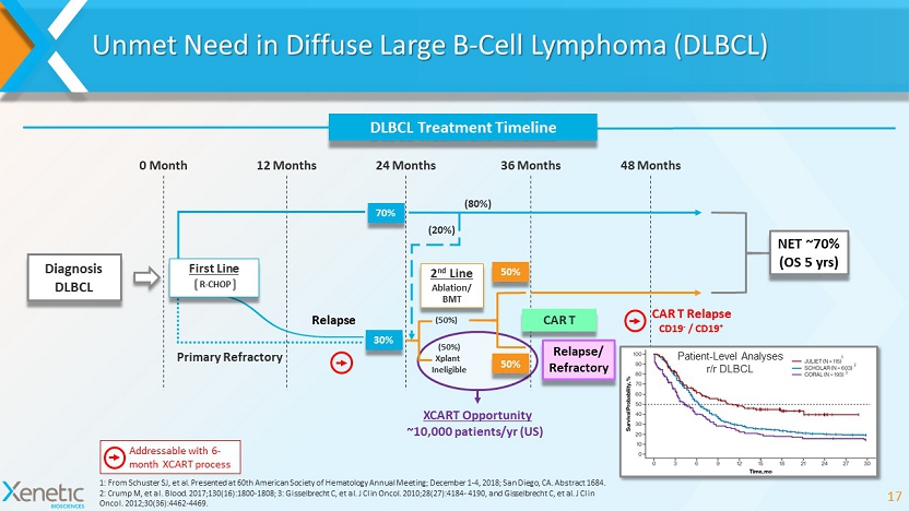 Addressable with 6 - month XCART process Unmet Need in Follicular Lymphoma (FL) 16 1: Casulo C. et al , J. Clin. Oncology , 2015 33:2516 - 2522 2: Montoto et al. J Clin Oncol. 2007 Jun 10;25(17):2426 - 33. Epub 2007 May 7 Time from Risk - Defining Event (months) Survival Probability (%) FL Treatment Timeline 5 - year survival rate: 90% Median OS from first POD: >12 years 5 - year survival rate: 50% Median OS from first POD: 5 years POD > 2 yrs (80%) (20%) R - CHOP; R - mono First Line Diagnosis FL Treatment Decisions Based On: - Tumor burden - Other risk factors (e.g. FLIPI) Time to first POD is an important prognostic indicator CAR T Second Line(s) R - CHOP R - mono R - CHOP Chemotherapy Targeted Agents Radioimmunotherapy High Dose Chemo / SCT Patients with FL have a 28 - 31% probability of high grade transformation at 10 years 2 POD < 2 yrs XCART Opportunity Patient - Level Analysis 1 ~3,000 patients/ yr (US) CAR T Relapse CD19 - / CD19 +