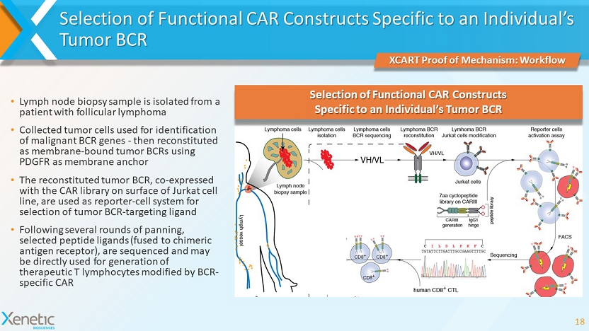 Selection of Functional CAR Constructs Specific to an Individual’s Tumor BCR 18 XCART Proof of Mechanism: Workflow Selection of Functional CAR Constructs Specific to an Individual’s Tumor BCR • Lymph node biopsy sample is isolated from a patient with follicular lymphoma • Collected tumor cells used for identification of malignant BCR genes - then reconstituted as membrane - bound tumor BCRs using PDGFR as membrane anchor • The reconstituted tumor BCR, co - expressed with the CAR library on surface of Jurkat cell line, are used as reporter - cell system for selection of tumor BCR - targeting ligand • Following several rounds of panning, selected peptide ligands (fused to chimeric antigen receptor), are sequenced and may be directly used for generation of therapeutic T lymphocytes modified by BCR - specific CAR