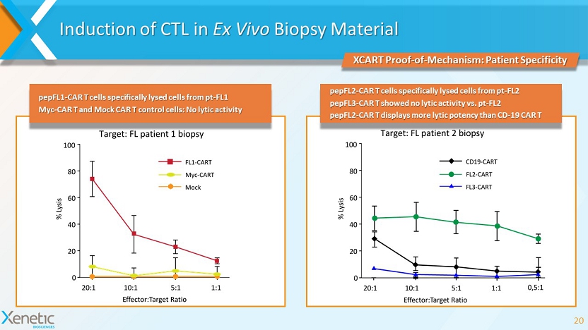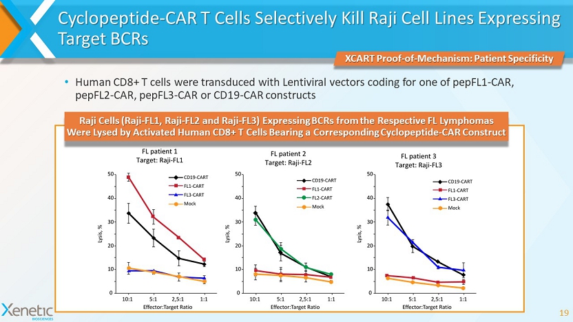 Cyclopeptide - CAR T Cells Selectively Kill Raji Cell Lines Expressing Target BCRs • Human CD8+ T cells were transduced with Lentiviral vectors coding for one of pepFL1 - CAR, pepFL2 - CAR, pepFL3 - CAR or CD19 - CAR constructs 19 XCART Proof - of - Mechanism: Patient Specificity Raji Cells (Raji - FL1, Raji - FL2 and Raji - FL3) Expressing BCRs from the Respective FL Lymphomas Were Lysed by Activated Human CD8+ T Cells Bearing a Corresponding Cyclopeptide - CAR Construct