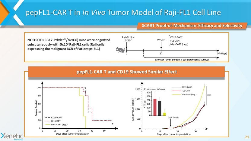 pepFL1 - CAR T in In Vivo Tumor Model of Raji - FL1 Cell Line 21 XCART Proof - of - Mechanism: Efficacy and Selectivity NOD SCID (CB17 - Prkdc scid / NcrCrl ) mice were engrafted subcutaneously with 5x10 6 Raji - FL1 cells (Raji cells expressing the malignant BCR of Patient pt - FL1) pepFL1 - CAR T and CD19 Showed Similar Effect