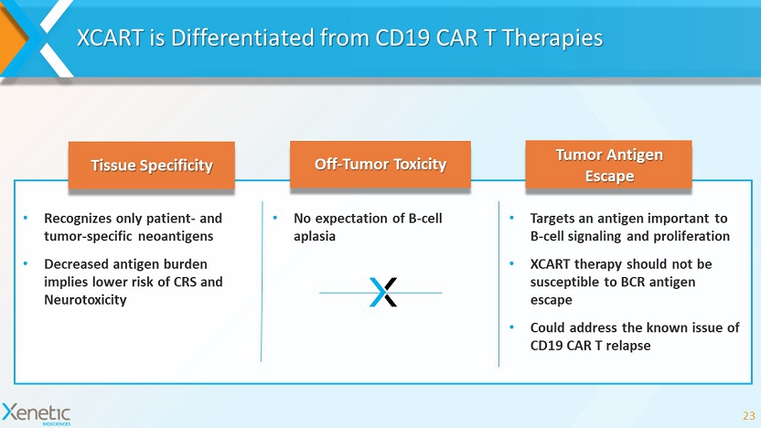 XCART Development Program Driving Towards IND Filing 22 2019 2020 2021 Screening Method Development Validation of End - to - End XCART Clinical Process Clinical Qualification Method Development Nonclinical Animal Studies CMC Process Development Development Approach Program Planning • TPP • Clinical & Regulatory Roadmap • Process & Method Parameters IND Program Strategy Collaboration with Site & PI for IIT Offers Operational/Cost Efficiencies and Risk Mitigation Accelerated Clinical Proof of Concept Early Engagement for Clinical Trial Conduct Integration of Development and Clinical Manufacturing Capabilities