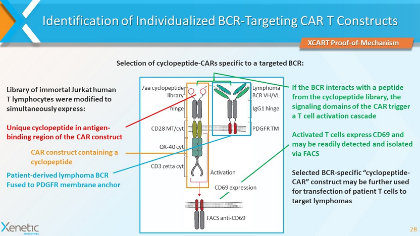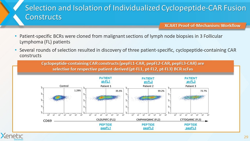 Identification of Individualized BCR - Targeting CAR T Constructs 28 Selection of cyclopeptide - CARs specific to a targeted BCR: 7aa cyclopeptide library hinge CD28 MT/ cyt OX - 40 cyt CD3 zetta cyt Lymphoma BCR VH/VL IgG1 hinge PDGFR TM Activation FACS anti - CD69 Library of immortal Jurkat human T lymphocytes were modified to simultaneously express: Unique cyclopeptide in antigen - binding region of the CAR construct If the BCR interacts with a peptide from the cyclopeptide library, the signaling domains of the CAR trigger a T cell activation cascade Activated T cells express CD69 and may be readily detected and isolated via FACS Selected BCR - specific “cyclopeptide - CAR” construct may be further used for transfection of patient T cells to target lymphomas XCART Proof - of - Mechanism CD69 expression CAR construct containing a cyclopeptide Patient - derived lymphoma BCR Fused to PDGFR membrane anchor