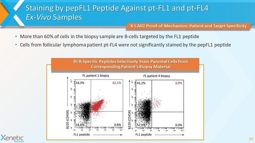 • Patient - specific BCRs were cloned from malignant sections of lymph node biopsies in 3 Follicular Lymphoma (FL) patients • Several rounds of selection resulted in discovery of three patient - specific, cyclopeptide - containing CAR constructs Selection and Isolation of Individualized Cyclopeptide - CAR Fusion Constructs 29 XCART Proof - of - Mechanism: Workflow Cyclopeptide - containing CAR constructs (pepFL1 - CAR, pepFL2 - CAR, pepFL3 - CAR) are selective for respective patient - derived (pt - FL1, pt - FL2, pt - FL3) BCR scFvs PATIENT pt - FL1 PATIENT pt - FL2 PATIENT pt - FL3 PEPTIDE pepFL1 PEPTIDE pepFL2 PEPTIDE pepFL3