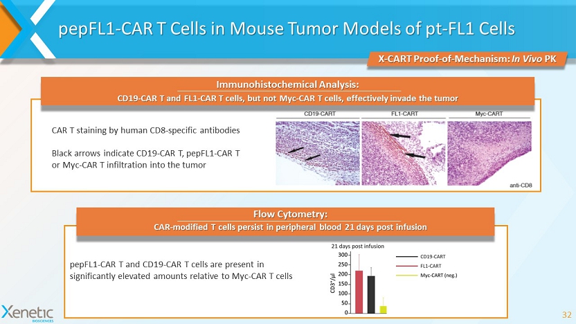 pepFL1 - CAR T Cells in Mouse Tumor Models of pt - FL1 Cells 32 X - CART Proof - of - Mechanism: In Vivo PK CAR T staining by human CD8 - specific antibodies Black arrows indicate CD19 - CAR T, pepFL1 - CAR T or Myc - CAR T infiltration into the tumor pepFL1 - CAR T and CD19 - CAR T cells are present in significantly elevated amounts relative to Myc - CAR T cells Immunohistochemical Analysis: CD19 - CAR T and FL1 - CAR T cells, but not Myc - CAR T cells, effectively invade the tumor CAR - modified T cells persist in peripheral blood 21 days post infusion Flow Cytometry: