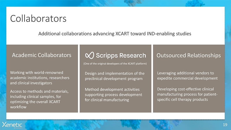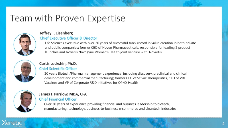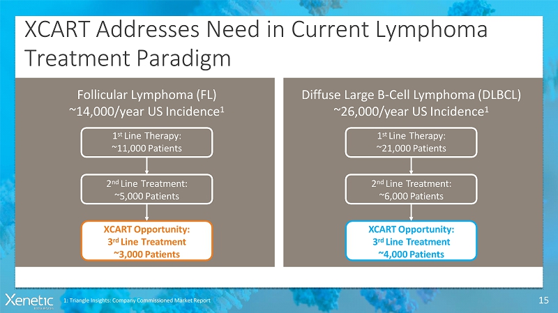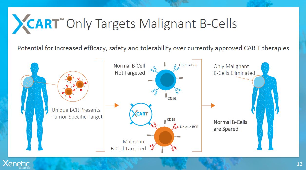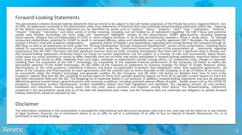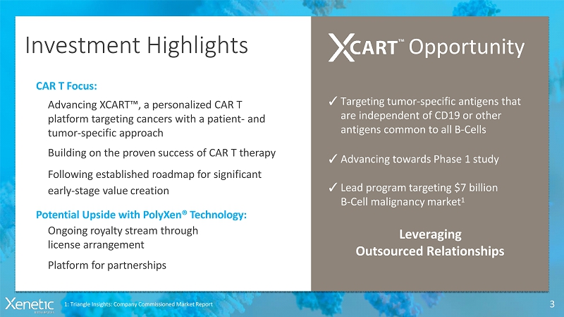 Forward-LookingStatements Thispresentationcontainsforward-lookingstatementsthatweintendtobesubjecttothesafeharborprovisionsofthePrivateSecuritiesLitigationReform Act of1995.Allstatementscontainedinthispresentationotherthanstatementsofhistoricalfactsmayconstituteforward-lookingstatementswithinthe meaning ofthefederalsecuritieslaws.Thesestatementscanbeidentifiedbywordssuchas"expects,""plans,""projects,""will,""may,""anticipates,""believes," "should,""intends,""estimates,"andotherwordsofsimilarmeaning,including,butnotlimitedto,allstatementsregarding:theCARTfocusandpotential upside with PolyXentechnology set forthunder the “InvestmentHighlights” section of this presentation; XCARTopportunities, including targeting tumor-specificantigensthatareindependentofCD19orotherantigenscommontoallB-CellsandadvancingtowardsaPhase1study;plans toleverage outsourcedrelationships;potentialforXCARTtoresultinincreasedefficacy,safetyandtolerabilityovercurrentlyapprovedCARTtherapies;thepotentialto conductaPhase1trialwithacademiccollaborators; potentialutilitiesofPolyXen;andexpectationsregardingcashrunwayfundingtheCompanythroughan INDfiling;aswellasallstatementssetforthunderthe“DrivingDevelopmentThroughOutsourcedRelationships”sectionofthispresentation,includingthose relatedtoupcomingpotentialmilestones,allstatementssetforthunderthe“InvestmentSummary”sectionofthispresentation;all statementsregarding expectationsthattheCARTtherapieswillholdsignificantrevenueshareby2026,includinganticipationsthattherewillbeasignificantdropinRituxanuse. Anyforward-lookingstatementscontainedhereinarebasedoncurrentexpectationsandaresubjecttoanumberofrisksanduncertainties.Manyfactors couldcauseouractualactivitiesorresultstodiffermateriallyfromtheactivitiesandresultsanticipatedinforward-lookingstatements.Importantfactorsthat couldcauseactualresultstodiffermateriallyfromsuchplans,estimatesorexpectationsinclude,amongothers,(1)unexpectedcosts,chargesorexpenses resultingfromtheacquisitionoftheCARTtechnology;(2)uncertaintyoftheexpectedfinancialperformanceoftheCompany;(3)failuretorealizethe anticipatedpotentialoftheXCARTtechnology;(4)theabilityoftheCompanytoimplementitsbusinessstrategy;(5)failureofScrippsResearchand/or PharmsynthezortheotheracademicinstitutionsinBelarusandRussia(asapplicable)toperformtheirobligationsundertheirrespectiveagreements; (6) failureoftheCompanyandPharmsyntheztoreachagreementswiththecontractsitesontermsfavorabletotheCompany,oratall;(7)failureofourlicensees tosuccessfullyutilizethePolyXentechnologyandgenerateroyaltiesfortheCompany;and(8)otherriskfactorsasdetailedfromtimetotimeinthe Company’sreportsfiledwiththeSEC,includingitsannualreportonForm10-K,periodicquarterlyreportsonForm10-Q,periodiccurrentreportsonForm8-K andotherdocumentsfiledwiththeSEC.Theforegoinglistofimportantfactorsisnotexclusive.Inaddition,forward-lookingstatementsmayalsobeadversely affectedbygeneralmarketfactors,generalbusinessandeconomicconditions,includingpotentialadverseeffectsofpublic healthissuessuchastheCOVID-19 pandemic,competitiveproductdevelopment,productavailability,federalandstateregulationsandlegislation,theregulatoryprocessfornewproduct candidatesandindications,manufacturingissuesthatmayarise,patentpositionsandlitigation,amongotherfactors.Theforward-looking statements containedinthispresentationspeakonlyasofthedatethestatementsweremade,andtheCompanydoesnotundertakeanyobligationtoupdateforward- lookingstatements,exceptasrequiredbylaw. Disclaimer Theinformationcontainedinthispresentationisprovidedforinformationalanddiscussionpurposesonlyandisnot,andmaynotbereliedoninanymanner aslegal,business,financial,taxorinvestmentadviceorasanoffertosellorasolicitationofanoffertobuyaninterestinXeneticBiosciences,Inc.orto participateinanytradingstrategy. 2