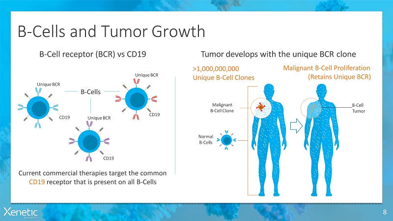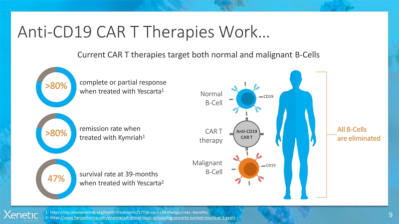 B-Cells and TumorGrowth 8 Tumor develops with the unique BCRcloneB-Cell receptor (BCR) vsCD19 Current commercial therapies target the common CD19 receptor that is present on allB-Cells CD19 CD19 Normal B-Cells Malignant B-Cell Proliferation (Retains UniqueBCR) >1,000,000,000 Unique B-CellClones CD19 UniqueBCR UniqueBCR UniqueBCR B-Cells Malignant B-CellClone B-Cell Tumor