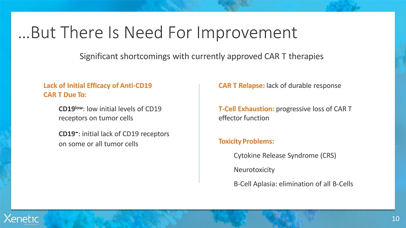 Anti-CD19 CAR T TherapiesWork… 9 1:https://my.clevelandclinic.org/health/treatments/17726-car-t-cell-therapy/risks--benefits; 2:https://www.fiercepharma.com/pharma/ash-gilead-touts-astounding-yescarta-survival-results-at-3-years Current CAR T therapies target both normal and malignantB-Cells >80% complete or partialresponse when treated withYescarta 1 >80% remission rate when treated withKymriah 1 47% survival rate at 39-months when treated withYescarta 2 AllB-Cells areeliminated Anti-CD19 CART CART therapy Normal B-Cell Malignant B-Cell CD19 CD19
