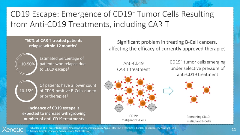 …But There Is Need ForImprovement 10 CAR T Relapse: lack of durableresponse T-Cell Exhaustion: progressive loss of CART effectorfunction ToxicityProblems: Cytokine Release Syndrome(CRS) Neurotoxicity B-Cell Aplasia: elimination of allB-Cells Significant shortcomings with currently approved CAR Ttherapies Lack of Initial Efficacy ofAnti-CD19 CAR T DueTo: CD19 low : low initial levels ofCD19 receptors on tumorcells CD19 - : initial lack of CD19 receptors on some or all tumorcells