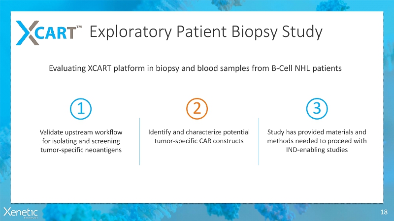 Exploratory Patient BiopsyStudy 18 Evaluating XCART platform in biopsy and blood samples from B-Cell NHLpatients 1 Validate upstream workflow for isolating and screening tumor-specificneoantigens 2 Identify and characterize potential tumor-specific CARconstructs 3 Study has provided materials and methods needed to proceed with IND-enablingstudies