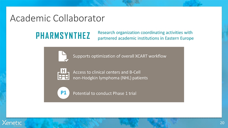 AcademicCollaborator 20 PHARMSYNTHEZ Research organization coordinating activities with partnered academic institutions in EasternEurope Supports optimization of overall XCARTworkflow Access to clinical centers and B-Cell non-Hodgkin lymphoma (NHL)patients Potential to conduct Phase 1trial P1