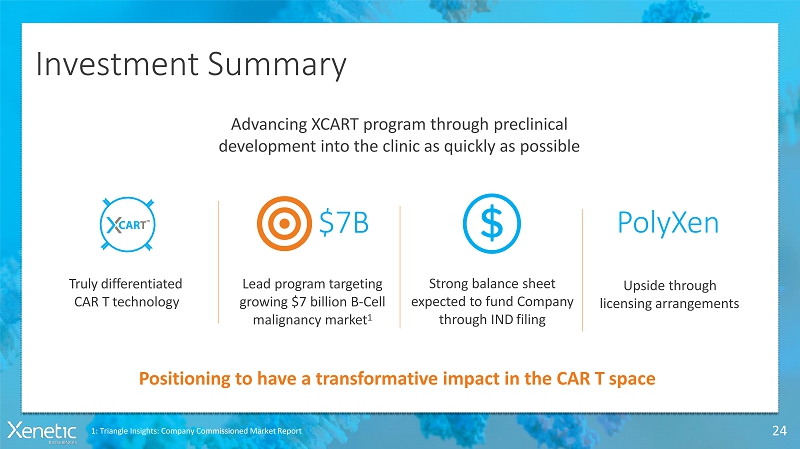 FinancialSnapshot NASDAQ:XBIO 23 Cash runway expected to fund Company through XCART INDfiling SharesOutstanding 2 ~9.7M Market Cap 1 ~$26M AverageVolume 1 ~10.1M 1: As of September 8,2021 2: As of August 6,2021 CashBalance $9.3M as of June 30,2021 Does not include net proceedsfrom $12.5 million privateplacement which closed on July 28,2021