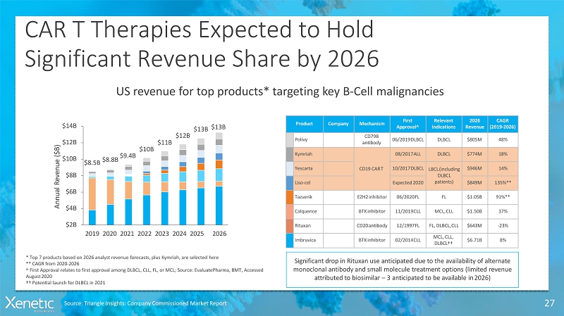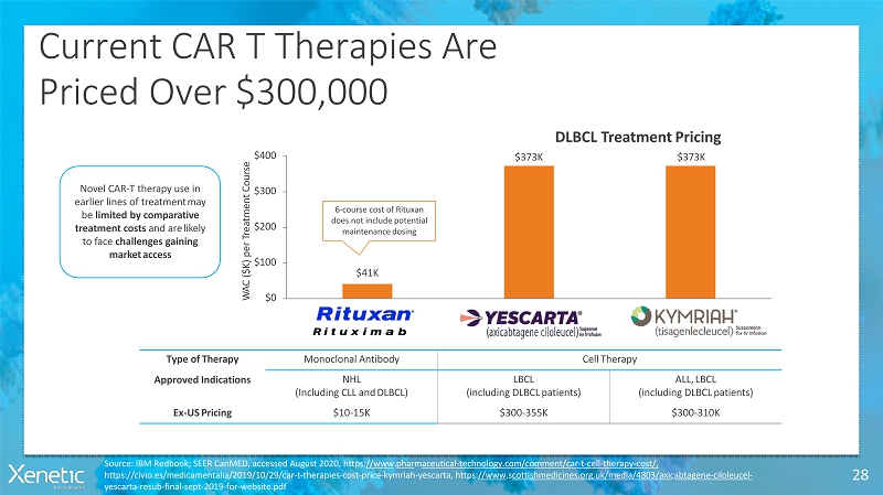 CAR T Therapies Expected toHold Significant Revenue Share by 2026 27 US revenue for top products* targeting key B-Cellmalignancies Product Company Mechanism First Approval^ Relevant Indications 2026 Revenue CAGR (2019-2026) Polivy CD79B antibody 06/2019DLBCL DLBCL $805M 48% Kymriah CD19 CART 08/2017ALL DLBCL $774M 18% Yescarta 10/2017DLBCL LBCL(including DLBCL patients) $946M 14% Liso-cel Expected2020 $849M 135%** Tazverik EZH2inhibitor 06/2020FL FL $1.05B 91%** Calquence BTKinhibitor 11/2019CLL MCL,CLL $1.50B 37% Rituxan CD20antibody 12/1997FL FL, DLBCL,CLL $643M -23% Imbruvica BTKinhibitor 02/2014CLL MCL,CLL, DLBCL†† $6.71B 8% Significant drop in Rituxan use anticipated due to the availability of alternate monoclonal antibody and small molecule treatment options (limited revenue attributed to biosimilar –3 anticipated to be available in2026) $8.5B $8.8B $9.4B $10B $11B $12B $13B $13B $10B $12B $14B $8B $6B $4B $2B 2019 2020 2021 2022 2023 2024 2025 2026 A n n u a l R e v e n u e ( $ B ) * Top 7 products based on 2026 analyst revenue forecasts, plus Kymriah, are selectedhere ** CAGR from2020-2026 ^ First Approval relates to first approval among DLBCL, CLL, FL, or MCL; Source: EvaluatePharma, BMT, Accessed August2020 †† Potential launch for DLBCL in2021 Source: Triangle Insights: Company Commissioned MarketReport