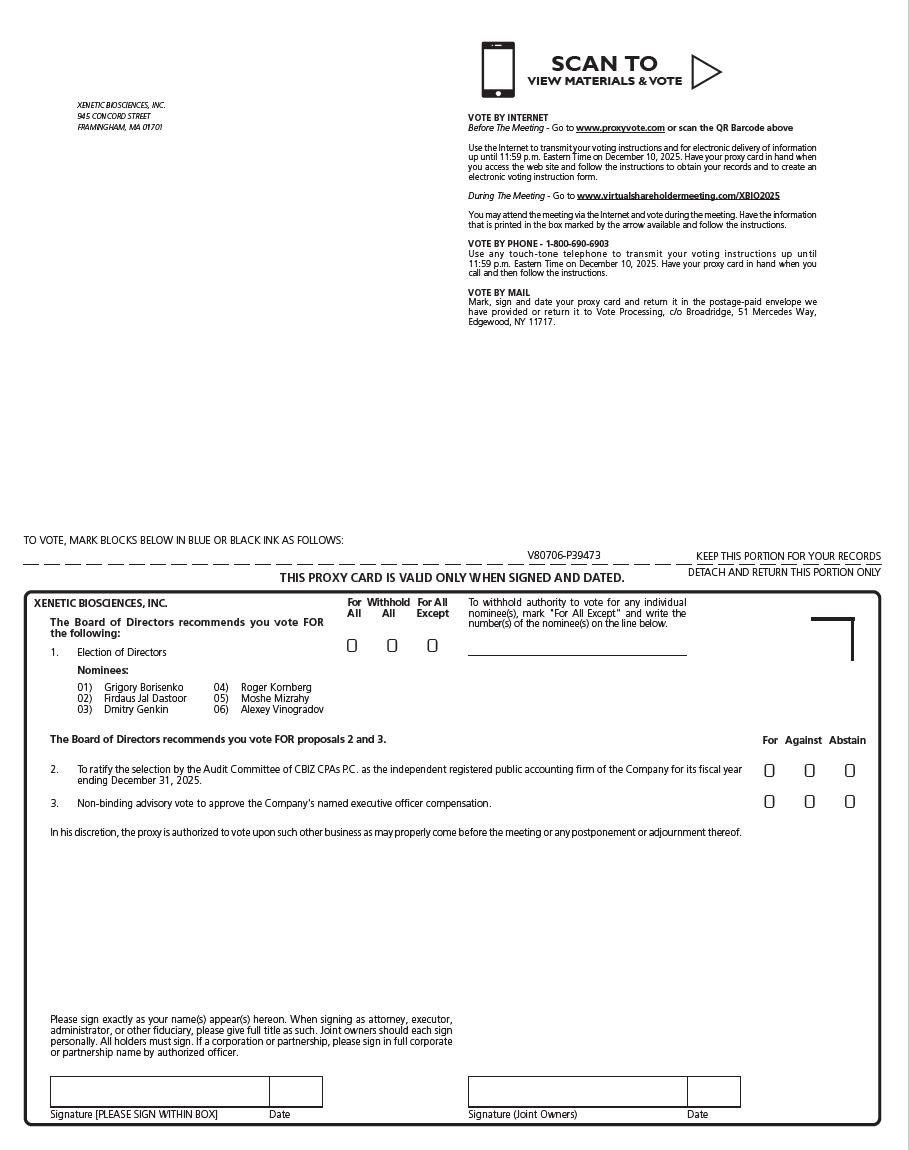Signature [PLEASE SIGN WITHIN BOX] Date Signature (Joint Owners) Date TO VOTE, MARK BLOCKS BELOW IN BLUE OR BLACK INK AS FOLLOWS: KEEP THIS PORTION FOR YOUR RECORDS DETACH AND RETURN THIS PORTION ONLY THIS PROXY CARD IS VALID ONLY WHEN SIGNED AND DATED. V80706 - P39473 For Withhold For All All All Except ! ! ! For Against Abstain ! ! ! ! ! ! To withhold authority to vote for any individual nominee(s), mark “For All Except” and write the number(s) of the nominee(s) on the line below . 2. To ratify the selection by the Audit Committee of CBIZ CPAs P.C. as the independent registered public accounting firm of the Company for its fiscal year ending December 31, 2025. 3. Non - binding advisory vote to approve the Company’s named executive officer compensation. In his discretion, the proxy is authorized to vote upon such other business as may properly come before the meeting or any postponement or adjournment thereof. The Board of Directors recommends you vote FOR proposals 2 and 3. XENETIC BIOSCIENCES, INC. The Board of Directors recommends you vote FOR the following: Please sign exactly as your name(s) appear(s) hereon . When signing as attorney, executor, administrator, or other fiduciary, please give full title as such . Joint owners should each sign personally . All holders must sign . If a corporation or partnership, please sign in full corporate or partnership name by authorized officer . 1. Election of Directors Nominees: 1) Grigory Borisenko 2) Firdaus Jal Dastoor 3) Dmitry Genkin 4) Roger Kornberg 5) Moshe Mizrahy 6) Alexey Vinogradov SCAN TO VIEW MATERIALS & VOTE VOTE BY INTERNET Before The Meeting - Go to www . proxyvote . com or scan the QR Barcode above Use the Internet to transmit your voting instructions and for electronic delivery of information up until 11 : 59 p . m . Eastern Time on December 10 , 2025 . Have your proxy card in hand when you access the web site and follow the instructions to obtain your records and to create an electronic voting instruction form . During The Meeting - Go to www . virtualshareholdermeeting . com/XBIO 2025 You may attend the meeting via the Internet and vote during the meeting . Have the information that is printed in the box marked by the arrow available and follow the instructions . VOTE BY PHONE - 1 - 800 - 690 - 6903 Use any touch - tone telephone to transmit your voting instructions up until 11 : 59 p . m . Eastern Time on December 10 , 2025 . Have your proxy card in hand when you call and then follow the instructions . VOTE BY MAIL Mark, sign and date your proxy card and return it in the postage - paid envelope we have provided or return it to Vote Processing, c/o Broadridge, 51 Mercedes Way, Edgewood, NY 11717 . XENETIC BIOSCIENCES, INC. 945 CONCORD STREET FRAMINGHAM, MA 01701