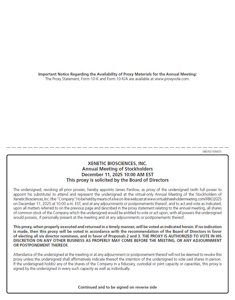 V80707 - P39473 XENETIC BIOSCIENCES, INC. Annual Meeting of Stockholders December 11, 2025 10:00 AM EST This proxy is solicited by the Board of Directors The undersigned, revoking all prior proxies, hereby appoints James Parslow, as proxy of the undersigned (with full power to appoint his substitute) to attend and represent the undersigned at the virtual - only Annual Meeting of the Stockholders of Xeneti c Biosciences, Inc . (the “Company”) t o be held by means of a live on - line webcast at www . virtualshareholdermeeting . com/XBIO 2025 on December 11 , 2025 at 10 : 00 a . m . EST, and at any adjournments or postponements thereof, and to act and vote as indicated, upon all matters referred to on the previous page and described in the proxy statement relating to the annual meeting, all shares of common stock of the Company which the undersigned would be entitled to vote or act upon, with all powers the undersigned would possess, if personally present at the meeting and at any adjournments or postponements thereof . This proxy, when properly executed and returned in a timely manner, will be voted as indicated herein . If no indication is made, then this proxy will be voted in accordance with the recommendation of the Board of Directors in favor of electing all six director nominees, and in favor of Proposals 2 and 3 . THE PROXY IS AUTHORIZED TO VOTE IN HIS DISCRETION ON ANY OTHER BUSINESS AS PROPERLY MAY COME BEFORE THE MEETING, OR ANY ADJOURNMENT OR POSTPONEMENT THEREOF . Attendance of the undersigned at the meeting or at any adjournment or postponement thereof will not be deemed to revoke this proxy unless the undersigned shall affirmatively indicate thereof the intention of the undersigned to vote said shares in person . If the undersigned hold(s) any of the shares of the Company in a fiduciary, custodial or joint capacity or capacities, this proxy is signed by the undersigned in every such capacity as well as individually . Important Notice Regarding the Availability of Proxy Materials for the Annual Meeting: The Proxy Statement, Form 10 - K and Form 10 - K/A are available at www.proxyvote.com. Continued and to be signed on reverse side