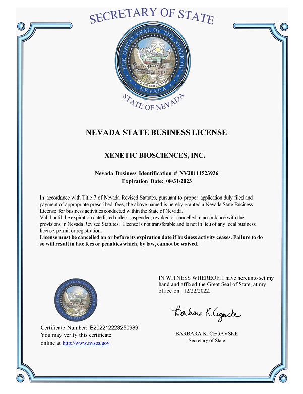NEVADA STATE BUSINESS LICENSE XENETIC BIOSCIENCES, INC. Nevada Business Identification # NV20111523936 Expiration Date: 08/31/2023 In accordance with Title 7 of Nevada Revised Statutes, pursuant to proper application duly filed and payment of appropriate prescribed fees, the above named is hereby granted a Nevada State Business License for business activities conducted within the State of Nevada . Valid until the expiration date listed unless suspended, revoked or cancelled in accordance with the provisions in Nevada Revised Statutes. License is not transferable and is not in lieu of any local business license, permit or registration. License must be cancelled on or before its expiration date if business activity ceases. Failure to do so will result in late fees or penalties which, by law, cannot be waived . Certificate Number: B202212223250989 You may verify this certificate online at http://www.nvsos.gov IN WITNESS WHEREOF, I have hereunto set my hand and affixed the Great Seal of State, at my office on 12/22/2022. BARBARA K. CEGAVSKE Secretary of State