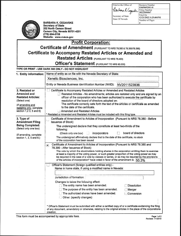ATTACHMENT BARBARA K. CEGAVSKE Secretary ofState 202 North Carson Street Carson City, Nevada 89701 - 4201 (775) 684 - 5708 Website: www.nvsos.aov. Certificate of Amendment PURSUANT TO NRS 78.385 and 78.390 Certificate of Amendment to Articles of Incorporation For Nevada Profit Corporations (Pursuant to NRS 78.385 and 78.390 - After Issuance ofStock) I. Name of Corporation: XENETIC BIOSCIENCES, INC. 2. Section 1 of Article Ill ohhe articles have been amended as follows: Article III, Section l Section l. Authorized Shares. The aggregate number of shares which the Corporation shall haw authority to issue is one hundred ten million (110,000,000) shares, consisting oftwo classes to be designated, one hundred million (100,000,000) shares shall be designated as "Common Stock" and ten million (10,000,000) shares shall be designated as undifferentiated blank check "Preferred Stock," with all of such shares have a par value of$.00 l per share. The Preferred Stock may be issued in one or more series, each series to be appropriately designated by a distinguishing letter or title, prior to the issuance of any shares thereof . The voting powers, designations, preferences, limitations, restrictions, and relative, participating, optional and other rights, and the qualifications, limitations, or restrictions thereof, of the Preferred Stock shall hereinafter be prescribed by resolution of the board of directors pursuant to Section 3 of this Article III . 3. The vote by which the stockholders holding shares in the corporation entitling them to exercise at least a majority of the voting power, or such greater proponion of the voting power as may be required in the case ofa vote by classes or series, or as may be required by the provisions of the articles of incorporation* have voted in favor of the amendment is: 50.3% 4. Effective date and time of filing: Date: December 21, 2022 Time: 12:02 AM ET 5. s · na re: ,l _ X 'J t .. .......u......i \ .,.,.,
