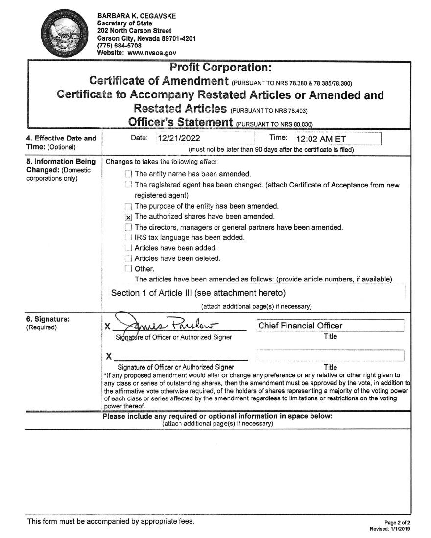 BARBARA K. CEGAVSKE Secretary of State 202 North Carson Street Carson City, Nevada 89701 - 4201 (775) 684 - 5708 Website: www.nvsos.gov Profit Corporation: CertYficate of Amendment <PuRsuANT TO NRs 1a.3ao & 1a . 3asna.39o> Certificate to Accompany Restated Articles or Amended and Res tated Articles <PuRsuANT TO NRs 1a . 4o3> Officer's Statement PURSUANT TO NRS 80.030 4. Effective Date and Time: (Optional) Date: I 12/21/2022 (must not be later than 90 days after the certificate is filed) 1 - · ·· ·· - · - ·· · ··"··· Time : 1 12:02 AM ET -- - 5. Information Being Changed: (Domestic corporations only) 6. Signature: (Required) Changes to takes the i'oliowing effect : [] The en t ity name has been amended. D The reg i stered agent has been changed. (attach Certificate of Acceptance from new registered agent) [] The purpose of the en tity has been amended. [?5] The authorized shares have been amended . [] The directors, managers or general partners have been amended. n IRS tax language has been added. l .. . l Articles have been added . ! I Artic l es have been de l e t ed. r -- 1 Other. The articles have been amended as f(?Uows : (provide article nurT1ber ! ε - Jl.:i I - ) Section 1 of Article Ill (see attachment hereto) (a tta ch additional page(s) if necessary) i Chief Financial Officer Title x Signature of Officer or Authorized Signer Title *If any proposed amendment would alter or change any preference or any relative or other right given to any class or series of outstanding shares, then the amendment must be approved by the vote, in addition to the affirmative vote otherwise required, of the holders of shares representing a majority of the voting power , of each class or series affected by the amendment regardless to limitations or restrictions on the voting I power thereof. Please include any required or optional information in space below: (attach additional page(s) if necessary) This form must be accompanied by appropriate fees. Page 2 of 2 Revised: 1/1/2019